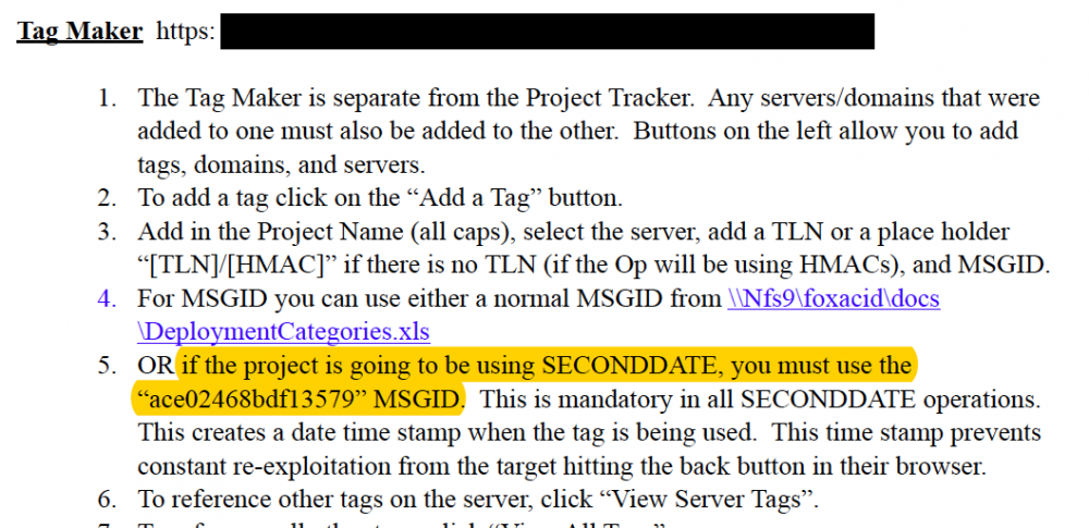 The top-secret manual that authenticates the SECONDDATE found in the wild as the same one used within the NSA is a 31-page document titled “FOXACID SOP for Operational Management” and marked as a draft. It dates to no earlier than 2010. A section within the manual describes administrative tools for tracking how victims are funneled into FOXACID, including a set of tags used to catalogue servers. When such a tag is created in relation to a SECONDDATE-related infection, the document says, a certain distinctive identifier must be used: