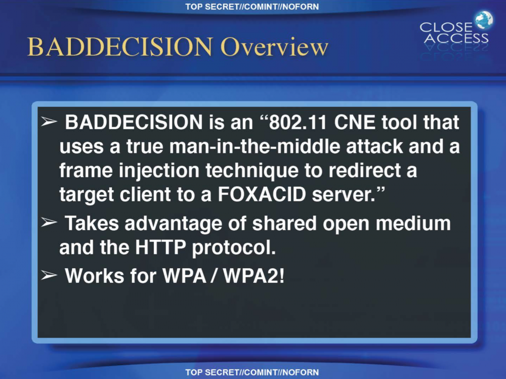 According to one December 2010 PowerPoint presentation titled “Introduction to BADDECISION,” that tool is also designed to send users of a wireless network, sometimes referred to as an 802.11 network, to FOXACID malware servers. Or, as the presentation puts it, BADDECISION is an “802.11 CNE [computer network exploitation] tool that uses a true man-in-the-middle attack and a frame injection technique to redirect a target client to a FOXACID server.” As another top-secret slide puts it, the attack homes in on “the greatest vulnerability to your computer: your web browser.”