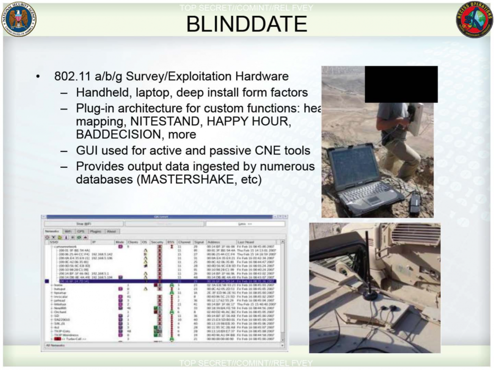 To position themselves within range of a vulnerable wireless network, NSA operators can use a mobile antenna system running software code-named BLINDDATE, depicted in the field in what appears to be Kabul. The software can even be attached to a drone. BLINDDATE in turn can run BADDECISION, which allows for a SECONDDATE attack: