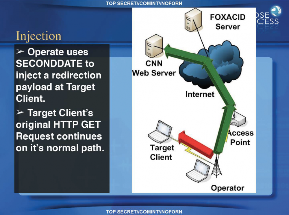 This overview jibes with previously unpublished classified files provided by Snowden that illustrate how SECONDDATE is a component of BADDECISION, a broader NSA infiltration tool. SECONDDATE helps the NSA pull off a “man in the middle” attack against users on a wireless network, tricking them into thinking they’re talking to a safe website when in reality they’ve been sent a malicious payload from an NSA server.
