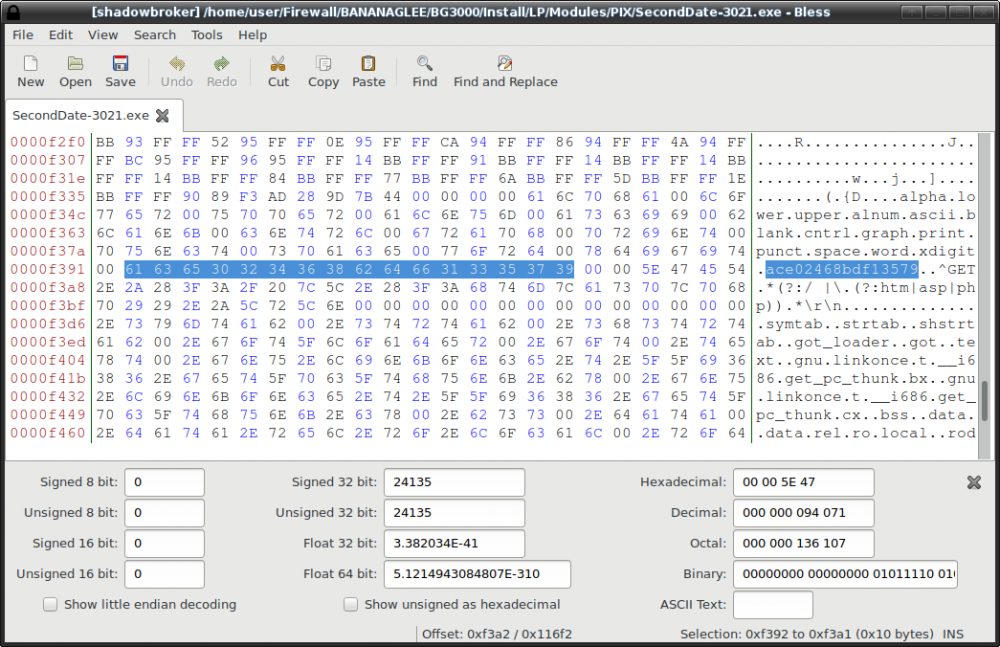 The same SECONDDATE MSGID string appears in 14 different files throughout the ShadowBrokers leak, including in a file titled SecondDate-3021.exe. Viewed through a code-editing program (screenshot below), the NSA’s secret number can be found hiding in plain sight: